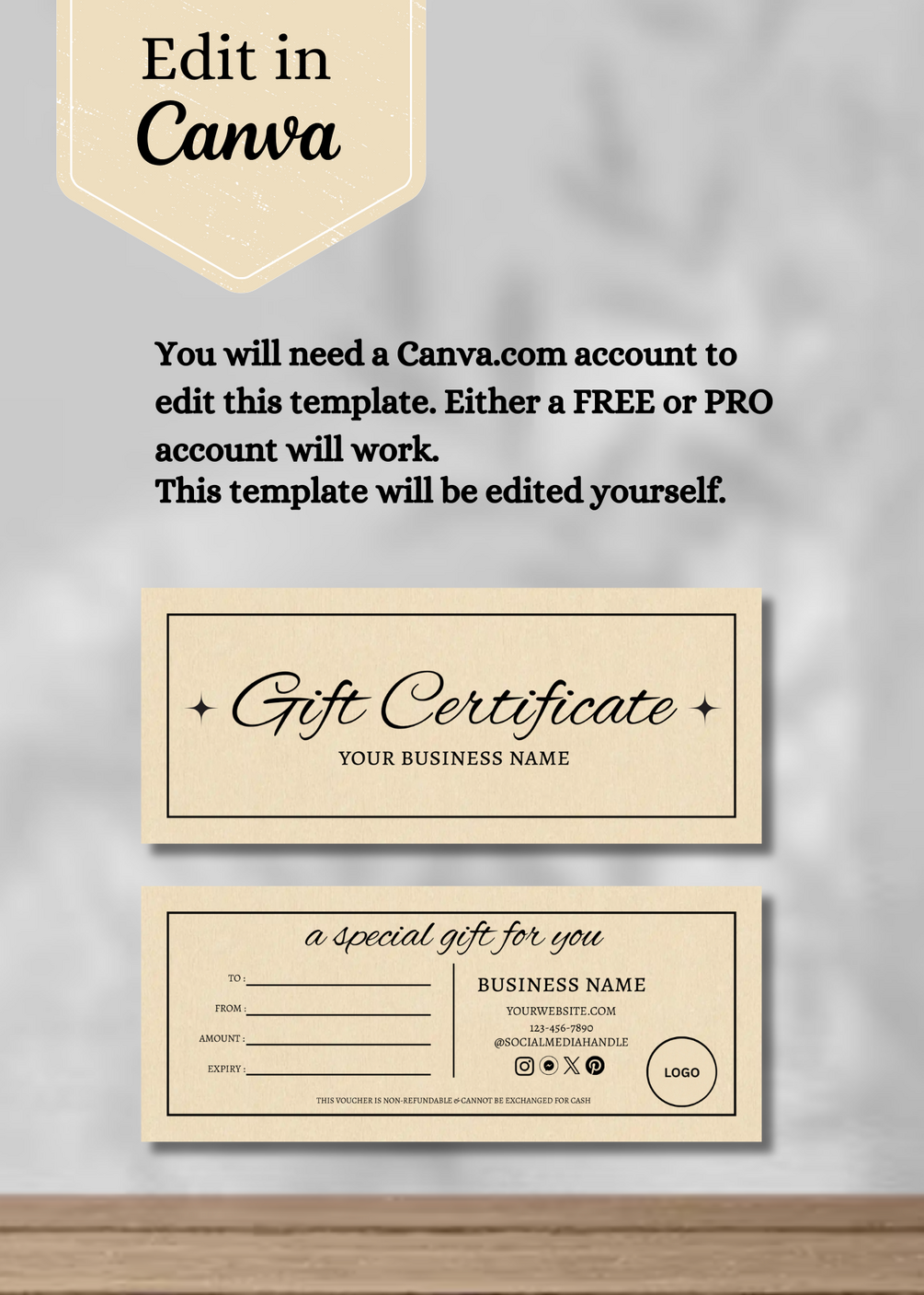· 1 Editable Gift CertificateTemplate for Canva sized at 8.5"x3.5"